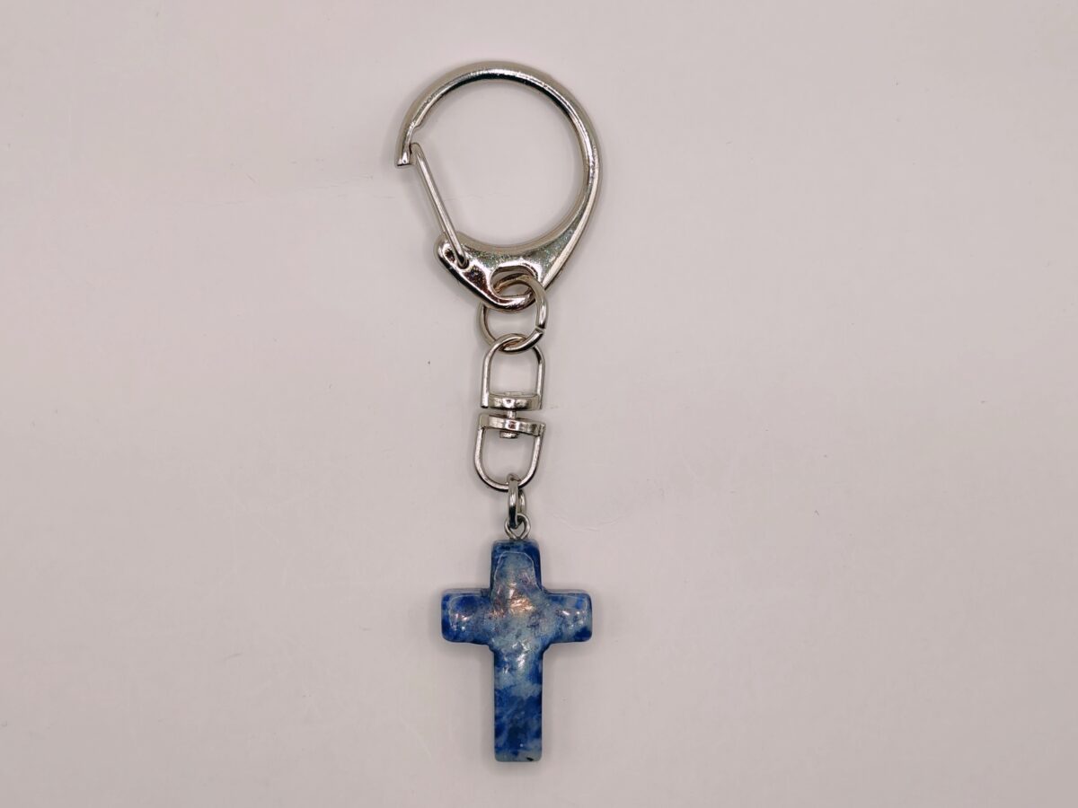 Praktická kľúčenka s krížikom z prírodného Sodalitu. Tento tmavomodrý kameň s bielymi žilkami je symbolom logiky, intuície a vnútorného pokoja, pričom tvar kríža dodáva nositeľovi pocit ochrany.