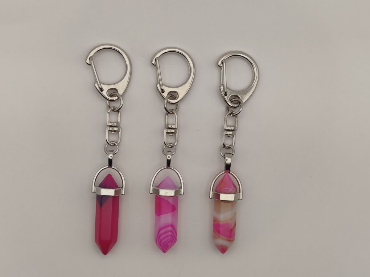 Táto kľúčenka obsahuje prírodný Achát vybrúsený do elegantného tvaru šesťhranného hrotu (generátora), ktorý je dodatočne dofarbený do ružova. Dofarbenie krásne vyzdvihuje prirodzenú vrstvenú štruktúru kameňa. Tvar šesťhranu pomáha usmerňovať a koncentrovať energiu minerálu. Ružový Achát je vnímaný ako kameň citovej rovnováhy, ktorý do života nositeľa vnáša jemnosť a mier.