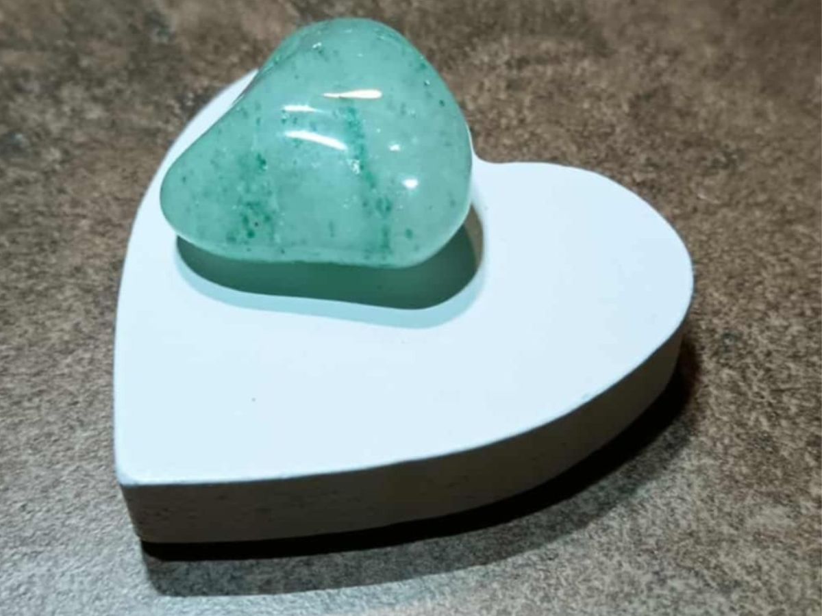 Prírodný minerál Avanturín nalepený na drevenom srdci s magnetom na opačnej strane. Ilustratívne zobrazenie. Farba a tvar sa môže pri každom kuse mierne líšiť.
