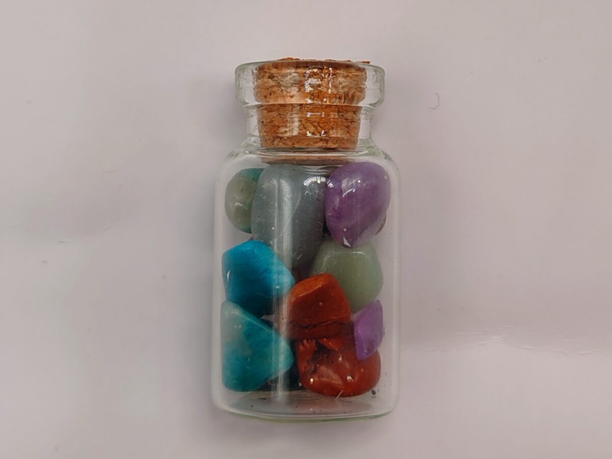 Táto drobná sklenená fľaštička ukrýva poklad v podobe zmesi sekaných polodrahokamov. Obsahuje mix rôznych kameňov (ako napr. krištáľ, ruženín, ametyst, jaspis, achát a iné), ktoré spolu vytvárajú harmonickú energetickú zmes. Je ideálna na nosenie vo vrecku či kabelke ako osobný talizman, alebo ako drobná dekorácia na pracovný stôl pre zlepšenie atmosféry.