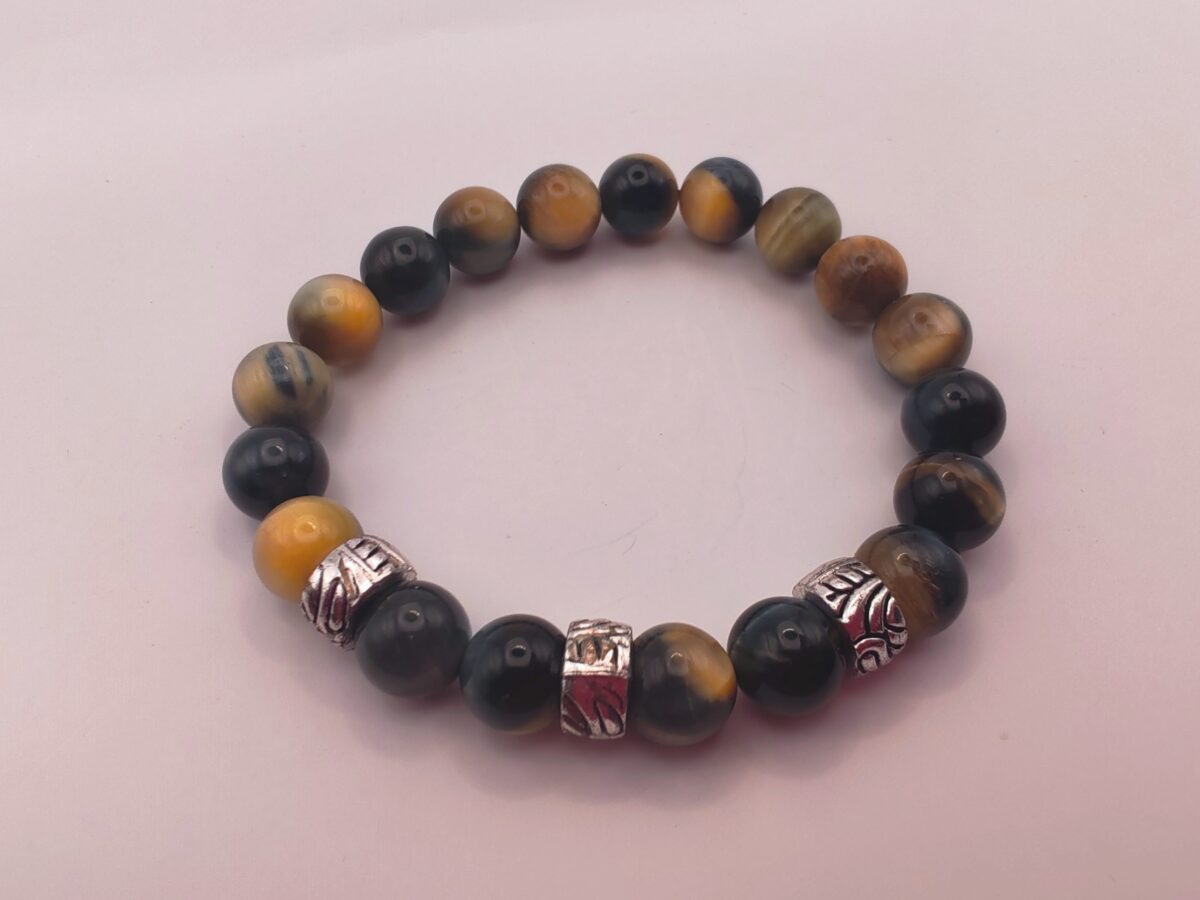 Náramok z korálok veľkosti 10 mm z prírodného Sokolieho a Levieho oka. Je navlečený na odolnej elastickej gumičke a má univerzálnu veľkosť pre obvod zápästia 20-21 cm.Ilustratívne zobrazenie. Farba sa môže pri každom kuse mierne líšiť.