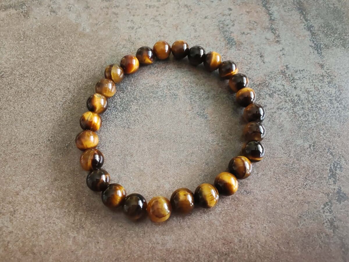 Náramok je vyrobený z guličiek prírodného kameňa Tigrie oko. Tento minerál je typický svojou hrou svetla a tieňa, ktorá pripomína oko šelmy. Jeho zlatisté až hnedé pásy sa pri pohybe menia a vytvárajú krásny vizuálny efekt. Je to tradične ochranný kameň, ktorý sa nosil ako talizman proti nepriateľským myšlienkam a kliatbám.