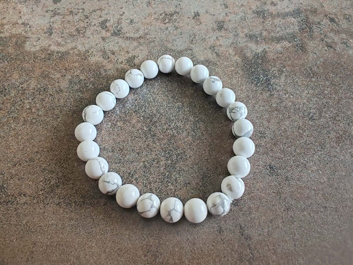 Náramok z korálok veľkosti 8 mm z MAGNEZITU. Je navlečený na odolnej elastickej gumičke a má univerzálnu veľkosť pre obvod zápästia 15 -18 cm. Ilustratívne zobrazenie. Farba sa môže pri každom kuse mierne líšiť. Magnezit je cenený pre svoje schopnosti upokojiť silné emócie a priniesť mentálnu jasnosť.