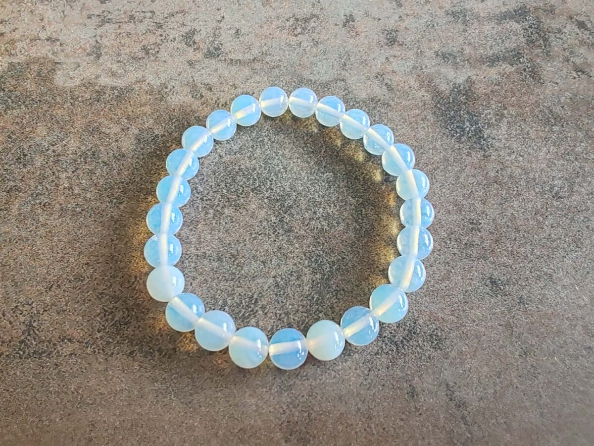 Náramok z korálok veľkosti 8 mm z OPALITU. Je navlečený na odolnej elastickej gumičke a má univerzálnu veľkosť pre obvod zápästia 15 -18 cm. Ilustratívne zobrazenie. Farba sa môže pri každom kuse mierne líšiť.