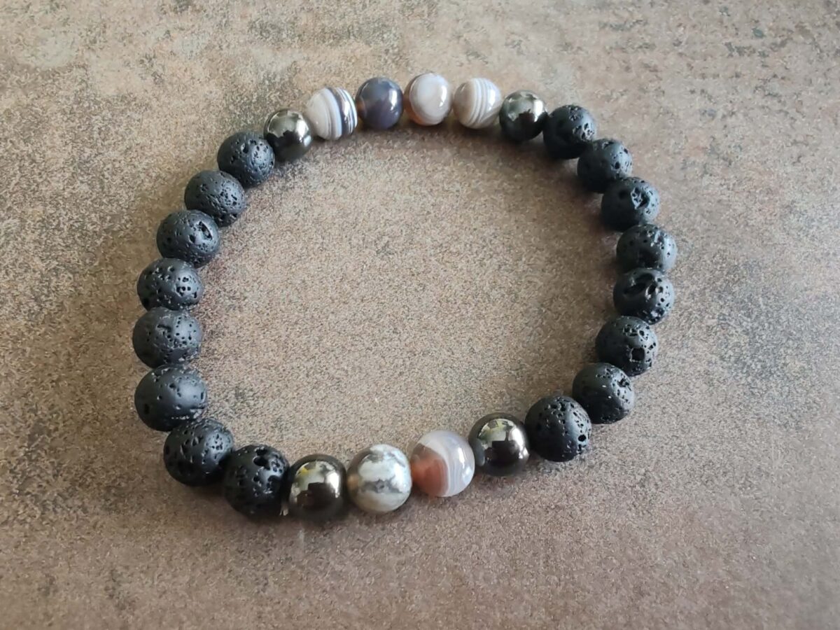 Náramok z korálok veľkosti 8 mm z prírodného HEMATITU, ACHÁTU a LÁVY . Je navlečený na odolnej elastickej gumičke a má univerzálnu veľkosť pre obvod zápästia 20 – 22 cm. Ilustratívne zobrazenie. Farba sa môže pri každom kuse mierne líšiť.
