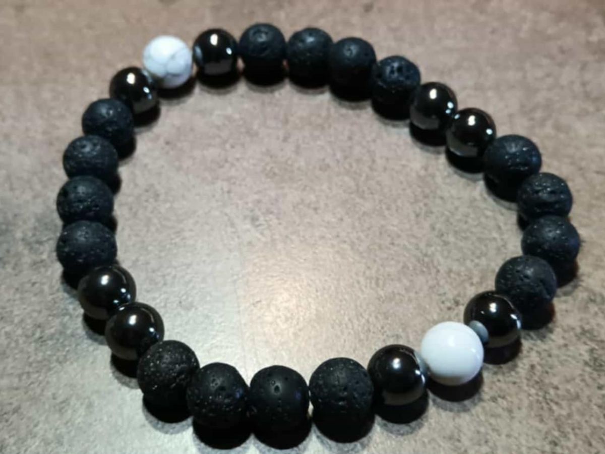 Náramok z korálok veľkosti 8 mm z prírodného HEMATITU, MAGNEZITU a LÁVY . Je navlečený na odolnej elastickej gumičke a má univerzálnu veľkosť pre obvod zápästia 20 – 22 cm. Ilustratívne zobrazenie. Farba sa môže pri každom kuse mierne líšiť.