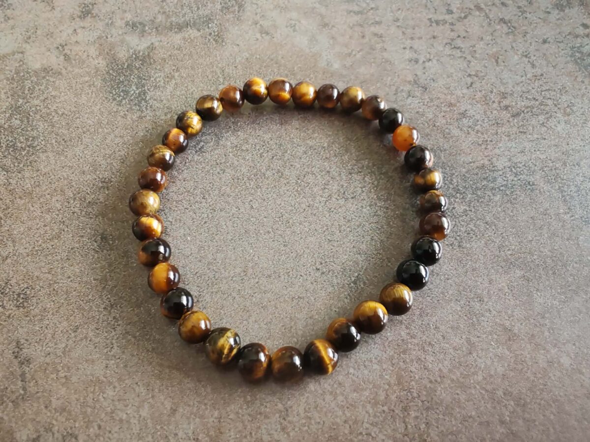 Náramok je vyrobený z guličiek prírodného kameňa Tigrie oko. Tento minerál je typický svojou hrou svetla a tieňa, ktorá pripomína oko šelmy. Jeho zlatisté až hnedé pásy sa pri pohybe menia a vytvárajú krásny vizuálny efekt. Je to tradične ochranný kameň, ktorý sa nosil ako talizman proti nepriateľským myšlienkam a kliatbám.