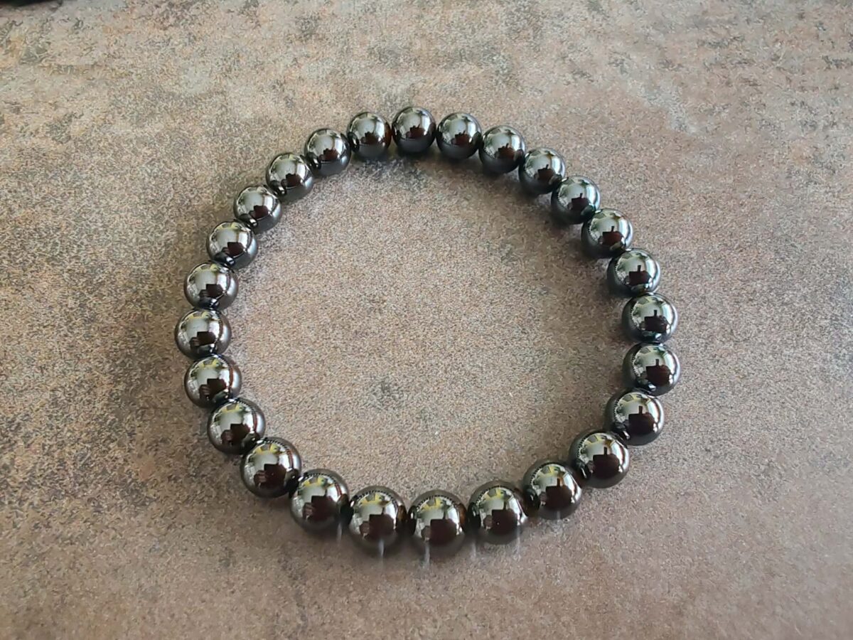 Náramok z korálok veľkosti 8 mm z prírodného hematitu. Je navlečený na odolnej elastickej gumičke a má univerzálnu veľkosť pre obvod zápästia 20 – 22 cm.