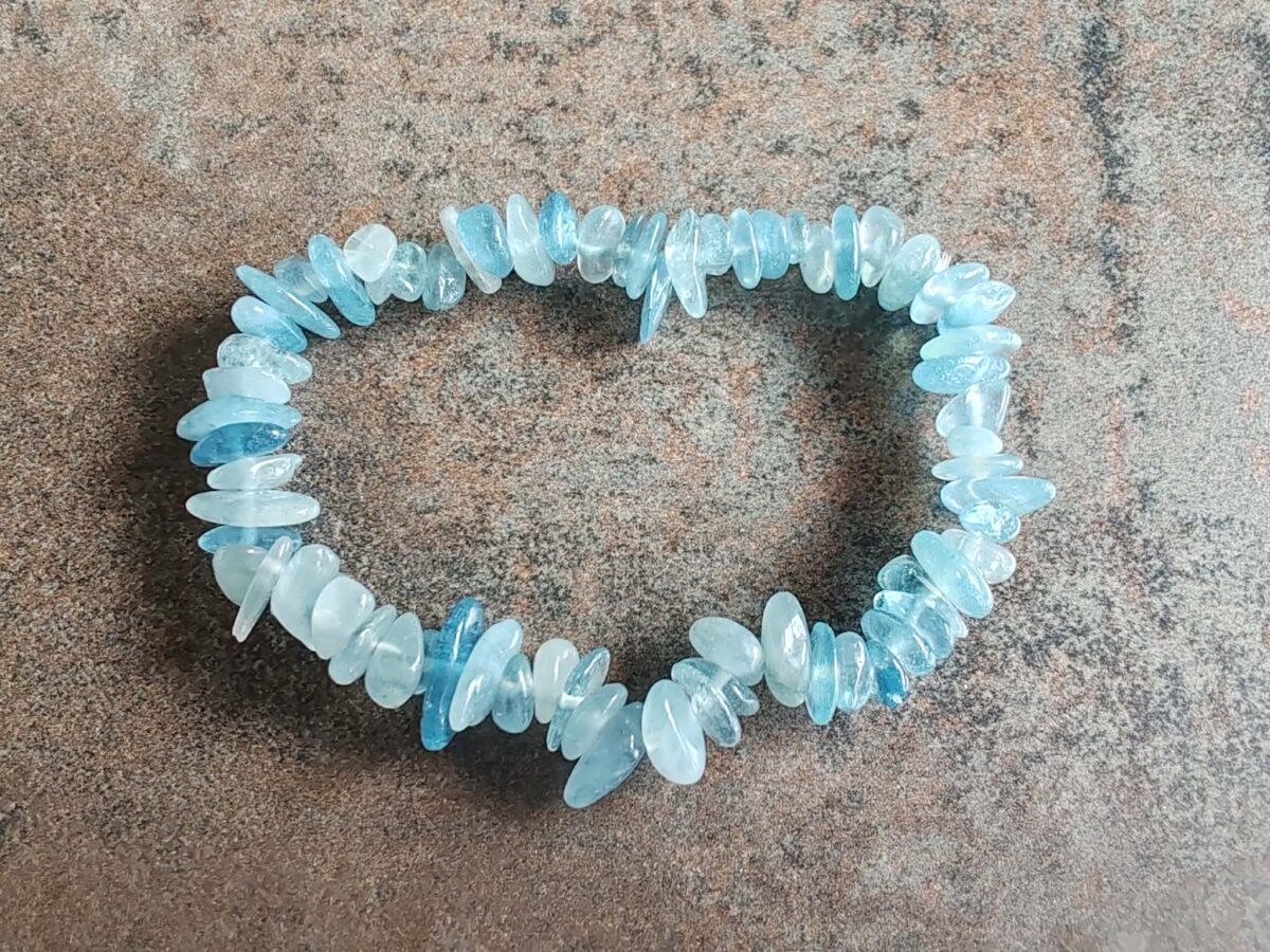 Náramok z leštených nepravidelných kamenných korálok veľkosti 4-8 mm z prírodného AKVAMARÍNU. Je navlečený na odolnej gumičke a má univerzálnu veľkosť pre obvod zápästia 15 -18 cm. Ilustratívne zobrazenie. Farba sa môže pri každom kuse mierne líšiť.
