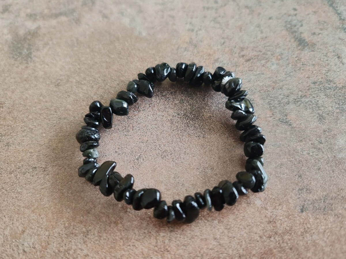 Tento náramok je vytvorený z nepravidelných korálok čierneho Obsidiánu. Obsidián vzniká rýchlym ochladením lávy, je to teda prírodné sopečné sklo bez kryštalickej štruktúry. Vďaka svojmu pôvodu v sebe nesie energiu ohňa a zeme. Je to kameň bez hraníc a obmedzení, ktorý pracuje veľmi rýchlo a s veľkou silou. Často sa nazýva „zrkadlom duše“, pretože nekompromisne odhaľuje pravdu a naše tienisté stránky, ktoré nám pomáha prijať a spracovať.