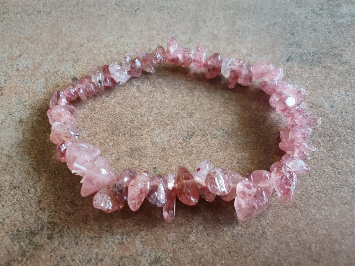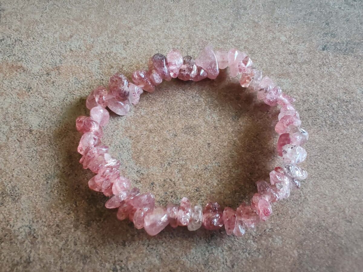 Náramok z leštených nepravidelných kamenných korálok veľkosti 4-8 mm z prírodného JAHODOVÉHO KREMEŇA. Je navlečený na odolnej gumičke a má univerzálnu veľkosť pre obvod zápästia 15 -18 cm. Ilustratívne zobrazenie. Farba sa môže pri každom kuse mierne líšiť.