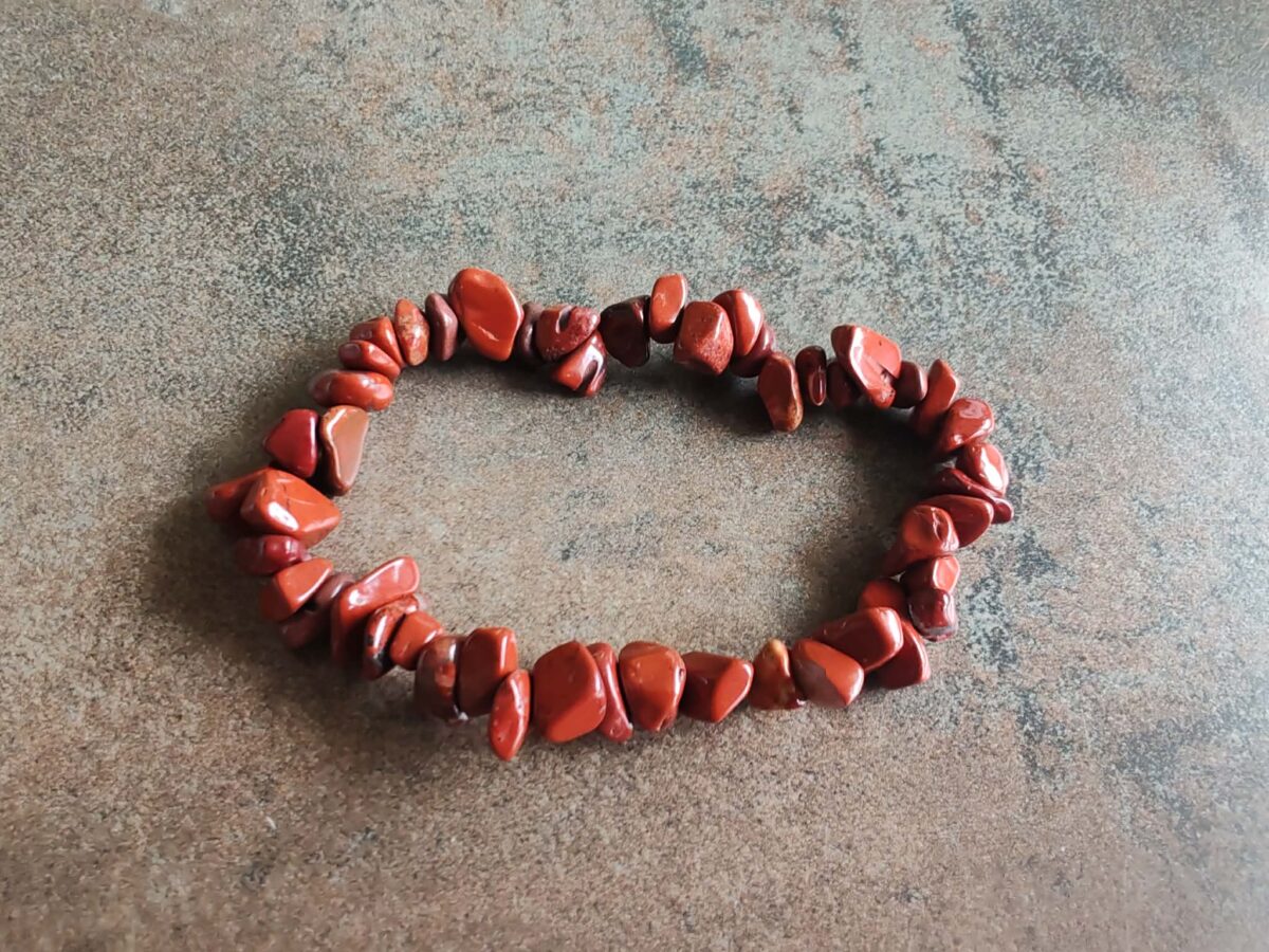 Elegantný dámsky náramok z leštených nepravidelných kamenných korálok veľkosti 4-8 mm z prírodného JASPISU. Je navlečený na odolnej gumičke a  univerzálnu veľkosť pre obvod zápästia 15 -18 cm. Ilustratívne zobrazenie. Farba sa môže pri každom kuse mierne líšiť. Jaspis je známy ako „matka všetkých kameňov“, symbolizujúci pokoj, stabilitu a silné spojenie so Zemou.