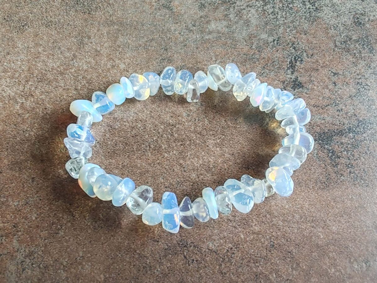 Náramok z leštených nepravidelných kamenných korálok veľkosti 4-8 mm z OPALITU. Je navlečený na odolnej gumičke a má univerzálnu veľkosť pre obvod zápästia 15 -18 cm. Ilustratívne zobrazenie. Farba sa môže pri každom kuse mierne líšiť.