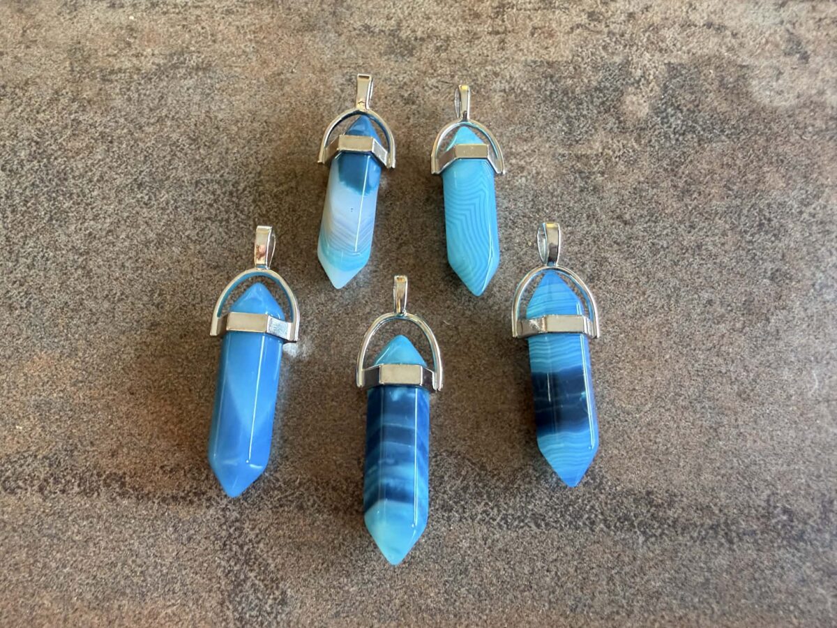 Prívesok z kameňa Achát brúsený do tvaru šesťhranu (kryštálu), dodatočne dofarbený pre vizuálny efekt a vyniknutie výnimočnej kresby do modra. Niektoré acháty môžu mať vo vnútri malé kremenné kryštáliky. Tvar šesťhranu pomáha koncentrovať energiu kameňa.