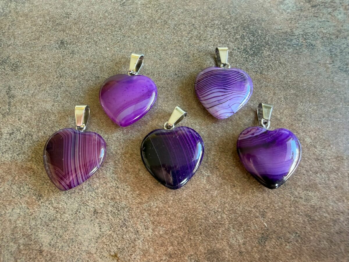 Prívesok v tvare srdca z kameňa ACHÁT, ktorý je dodatočne dofarbený pre vizuálny efekt a vyniknutie výnimočnej kresby do fialova. Achát podporuje sebadôveru a sebapoznanie. Zlepšuje sústredenie, logické myslenie, pamäť a kreativitu, dodáva odvahu a vytrvalosť.