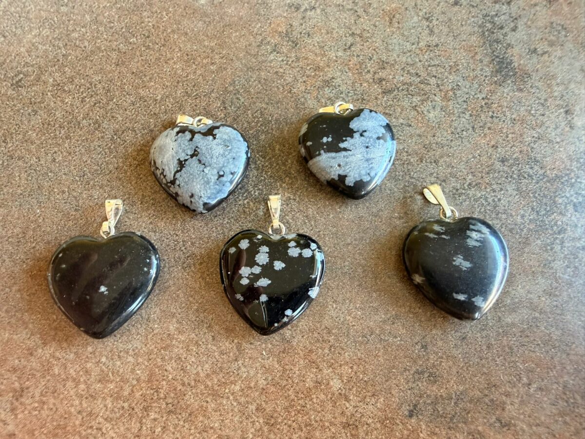 Tento prívesok v tvare srdca je z vločkového Obsidiánu. Obsidián vzniká rýchlym ochladením lávy, je to teda prírodné sopečné sklo bez kryštalickej štruktúry. Vďaka svojmu pôvodu v sebe nesie energiu ohňa a zeme. Je to kameň bez hraníc a obmedzení, ktorý pracuje veľmi rýchlo a s veľkou silou. Často sa nazýva „zrkadlom duše“, pretože nekompromisne odhaľuje pravdu a naše tienisté stránky, ktoré nám pomáha prijať a spracovať.