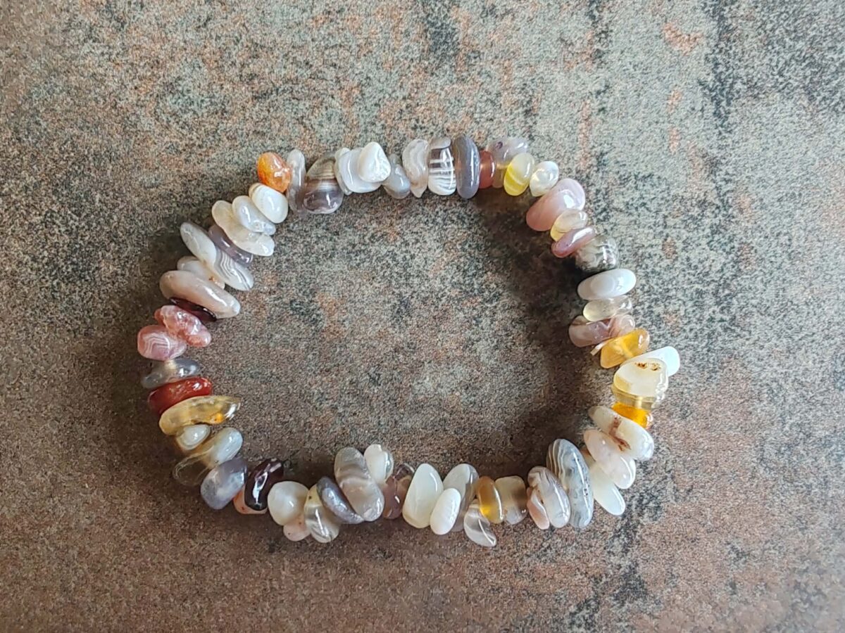 Náramok z leštených nepravidelných kamenných korálok veľkosti 4-8 mm z prírodného achátu. Je navlečený na odolnej gumičke a má univerzálnu veľkosť pre obvod zápästia 15 -18 cm. Ilustratívne zobrazenie. Farba sa môže pri každom kuse mierne líšiť.